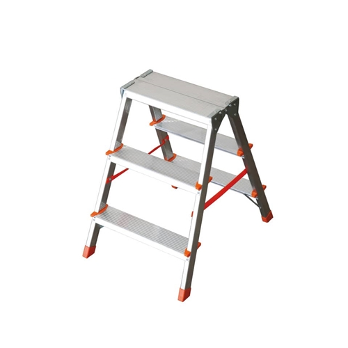 Doppia salita in alluminio. N°6 rivetti ogni gradino. Cerniere d’acciaio e n° 6 altezze di lavoro. Max 150 Kg. EN131. 81/2008. Dimensioni 46x63x62 cm.