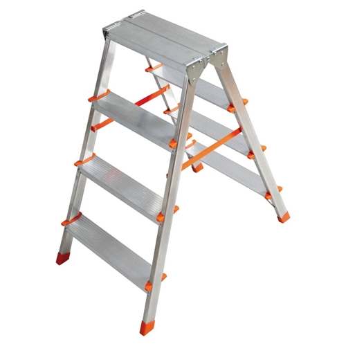 Doppia salita in alluminio. N°6 rivetti ogni gradino. Cerniere d’acciaio e n° 6 altezze di lavoro. Max 150 Kg. EN131. 81/2008. Dimensioni 49x80x84 cm.