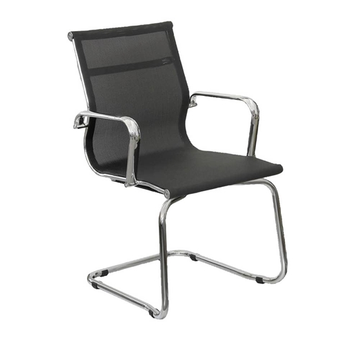 Sedia visitatore direzionale su slitta Unisit Pollux Space PXV, una poltrona tecnologicamente avanzata con seduta in rete metallica ergonomica e traspirante, di colore nero.