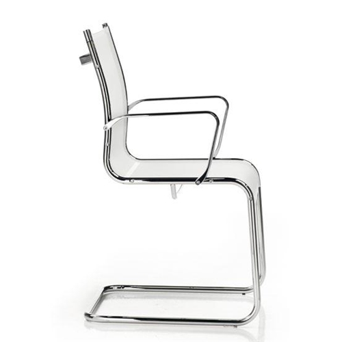 Sedia visitatore direzionale su slitta Unisit Pollux Space PXV, una poltrona tecnologicamente avanzata con seduta in rete metallica ergonomica e traspirante, di colore bianco.