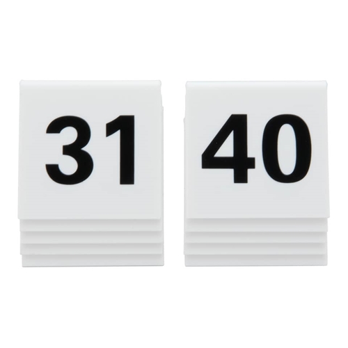 Set di 10 cavalierini segna posto in plastica di colore bianco per la numerazione dei tavoli. I segnaposto sono di colore bianco e hanno numerazione progressiva da 31 a 10.