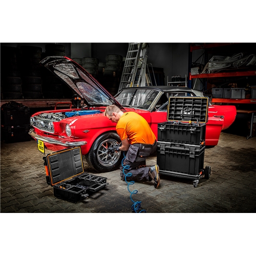 Il sistema modulare completo, set NEO (n° art. 84-259) è costituito da una struttura stabile a tre moduli su una piattaforma con ruote, destinato al trasporto e allo stoccaggio di utensili per l’edilizia. La struttura molto resistente consente di trasportare molti attrezzi pesanti e di salire sul coperchio per raggiungere punti elevati. I moduli dispongono di molte comode soluzioni come scomparti regolabili, elementi di fissaggio robusti, impugnatura robusta, guarnizioni nei coperchi, resistenza alla polvere e all’acqua, vassoi profondi, scasso per il taglio dotato di metro, elevata capacità.