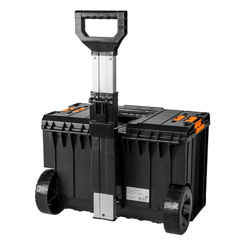 Cassetta modulare su ruote (n° art. 84-266), moduli che svolgono la funzione di cassetta capiente e piattaforma mobile con manico telescopico regolabile. Cassetta resistente per il trasporto e lo stoccaggio di utensili per l’edilizia. La guarnizione presente sul coperchio protegge efficacemente gli utensili contro polvere e umidità. Lo scasso con metro presente sul coperchio consente una presa salda e un facile taglio di tubi, listelli. ecc. La cassetta contiene un vassoio per utensili e uno scompartimento per mantenere in ordine la minuteria. La cassetta può essere utilizzata anche come sgabello con schienale per riposare in cantiere. Il marchio NEO soddisfa le aspettative dei professionisti.