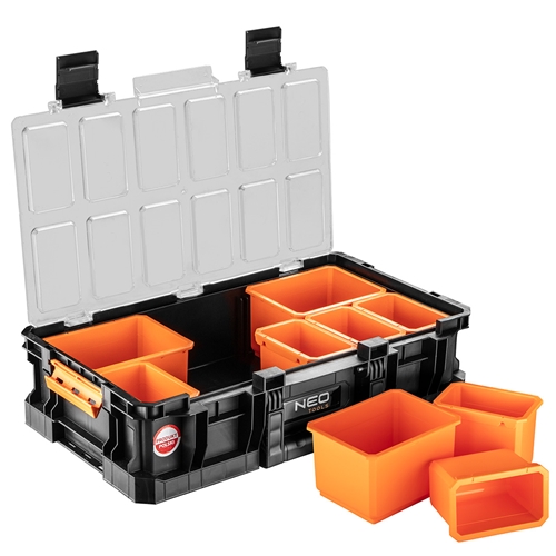 Organizer, sistema modulare II NEO TOOLS (rif. 84-060) per accessori più piccoli. Coperchio in policarbonato, chiusure in poliammide e una forte maniglia garantiscono sicurezza e comfort di lavoro. L'organizzatore è dotato di 9 bidoni in due dimensioni. Può essere combinato con altri moduli.
