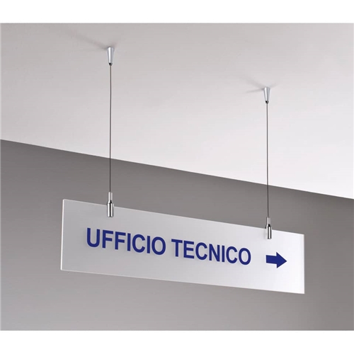 Targa sopesa bifacciale in acrilico bisatinato per grafica in vinile adesivo. Dotata di viti e tasselli. Fissaggio a soffitto.