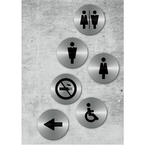 Targhette adesive in acciaio inox assortite. Sei targhette da attaccare sulla porta o sui muri. Icone: Donna, Uomo, Donna/Uomo, Accessibile ai disabili, Freccia e Vietato Fumare.