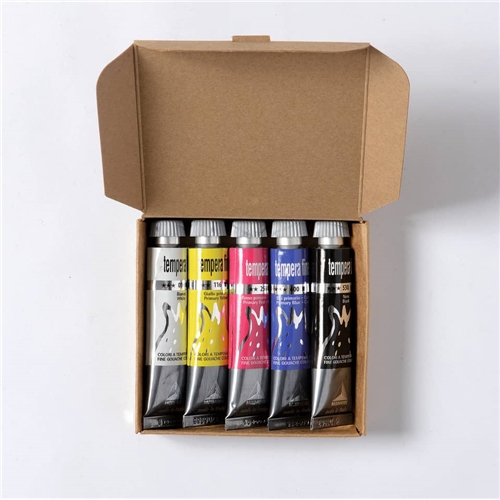 Colore a tempera fine in tubetto di alluminio da 20 ml. Grado di coprenza: semicoprente. Perfetta per le attività scolastiche. Pasta densa e corposa che rende il colore adatto anche a sfondi scuri. Alta resistenza alla luce secondo la normativa ASTM - D4303 per la tempera. Compatibili con tutti i colori e gli additivi per pittura ad acqua. Tempo di essicazione breve. Granulometria media 10 micron. Confezione da 5 colori primari assortiti.