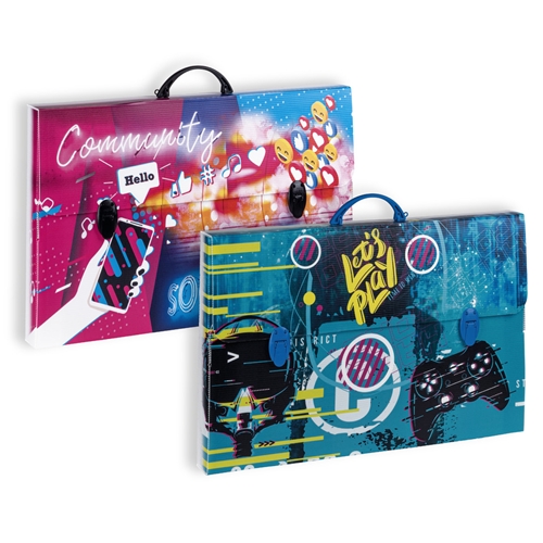 Valigetta in polipropilene alveolare con stampa ''SOCIAL''. Disponibili in 6 soggetti assortiti. Complete di film protettivo e chiusura a 2 clip. Dimensioni 56,5x36,5x5,5 cm.