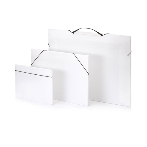 Valigetta Portfolio in polipropilene alveolare neutro con chiusura a elastico. Completa di film protettivo. Formato 53(L)x37(H) dorso 1 cm. Colore valigetta neutro. Colore accessori assortiti.